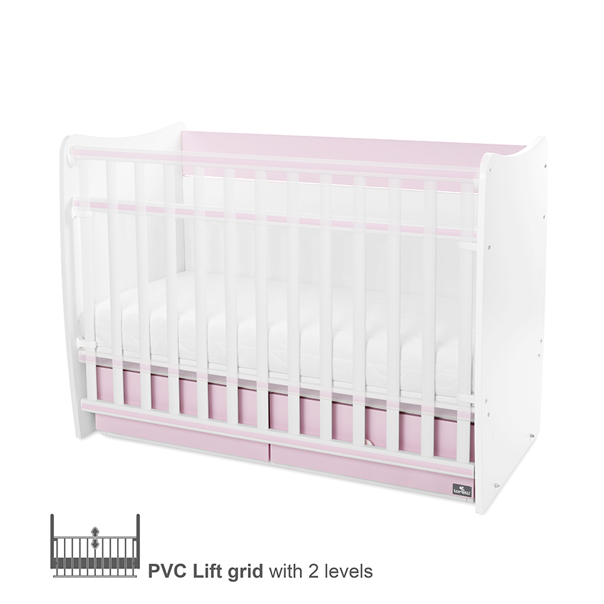 • Ρυθμιζόμενο πλαϊνό κιγκλίδωμα PVC με δύο επίπεδα και αυτόματο κλείδωμα στην επάνω και στην κάτω θέση, καθώς και σταθερό (ακίνητο) κιγκλίδωμα